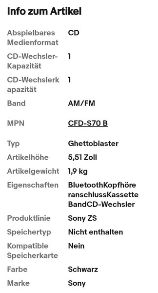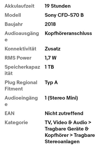 Sony CFD-S70 CD Kassette FM/AM Ghettoblaster, Antenne defekt €20 T.0163/1694190